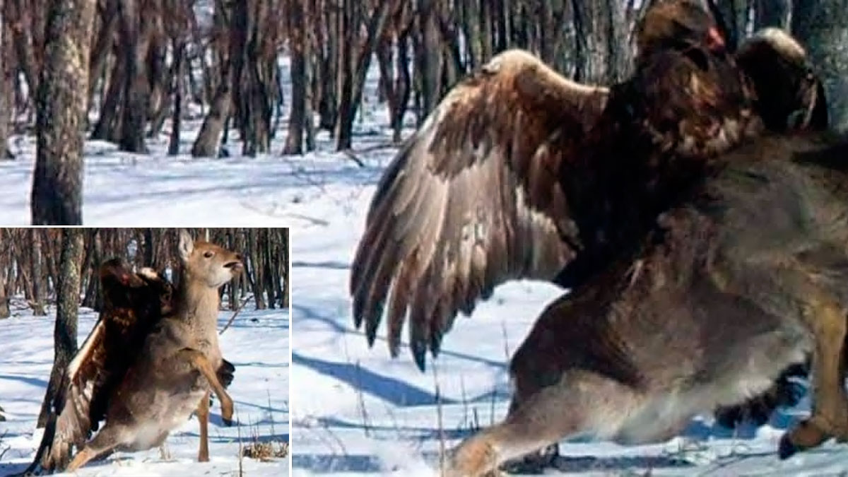 El peso de un corzo siberiano (Capreolus pygardus), también llamado corzo asiático, cuenta con un tamaño mayor que sus parientes europeos. Puede alcanzar los 40 kilos en la báscula y medir 1,3 metros de altura. Esto lo convierte en una presa mucho más complicada para depredadores como el águila real. Pero en un entorno totalmente nevado donde otras presas más habituales como roedores y pequeños mamíferos son ocultados por la nieve, el hambre lleva a cualquier predador a intentarlo con animales más corpulentos y que entrañan mayores riesgos a la hora de luchar con ellos.