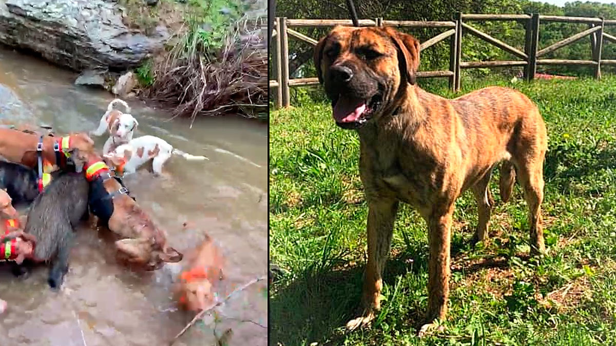 Dos alanos españoles se lanzan a un canal de riego persiguiendo a un jabalí