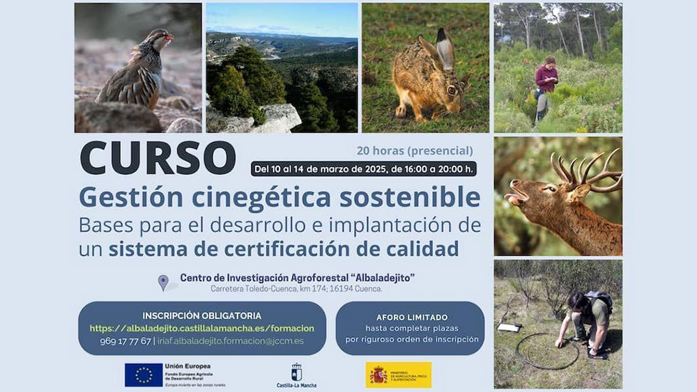 Gracias a las acciones de formación complementaria promovidas por el Centro de Investigación Agroforestal (CIAF) “Albaladejito”, la primera edición del curso “Gestión cinegética sostenible: Bases para el desarrollo e implantación de un sistema de certificación de la calidad” se impartirá de forma totalmente gratuita entre el 10 y el 14 de marzo de 2025 en las instalaciones de este centro del Instituto Regional de Investigación y Desarrollo Agroalimentario y Forestal de Castilla-La Mancha (IRIAF) en Cuenca (España), de forma presencial y en horario de tardes (16:00-20:00 h.).