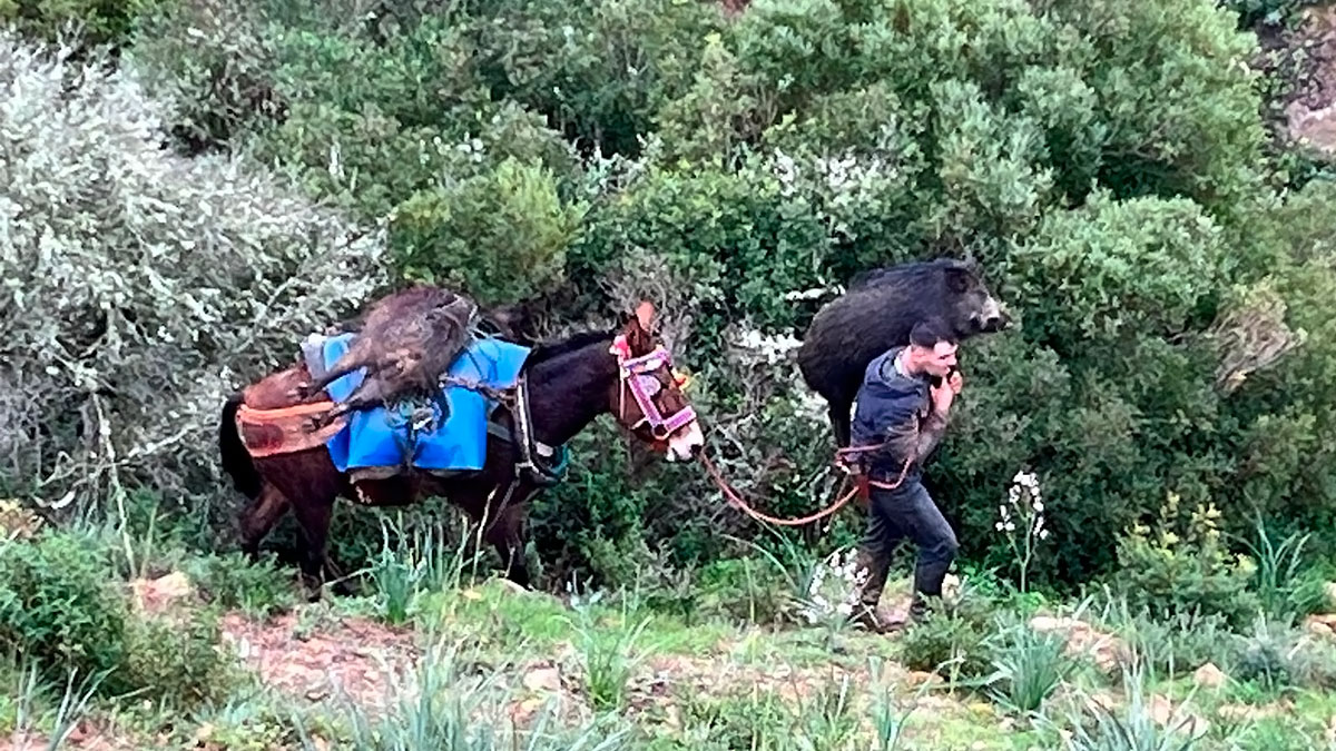 Juan Manuel lleva sobre sus hombros un gran jabalí para aliviarle la carga a Kiko, su mulo.