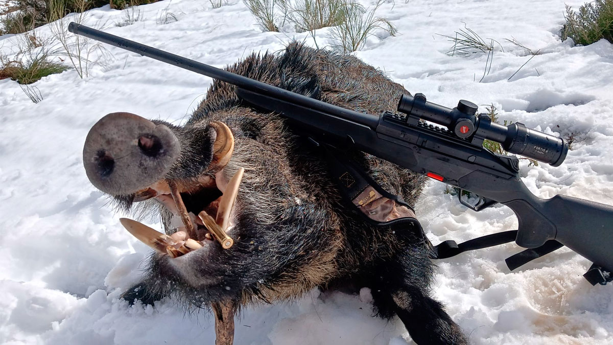 Pedro estaba escuchando cómo los perros y el escándalo de sus ladras delataban la posición del macareno. Nos lo narra en primera persona: “Me lo estaban avisando por la emisora, ‘Pedrito, te va a salir’. Y así ha sido. El primer arranque del jabalí ha sido impresionante. En esos 30 metros iniciales de carrera corría por la nieve a una velocidad altísima. Yo estaba acompañado en el puesto por una cachorra de sabueso de Baviera. La perra, al verlo, ha ladrado. No sé si ha sido por eso, pero el jabalí, que avanzaba sin quitar ojo a los perros que lo perseguían, se ha parado y se ha vuelto”.