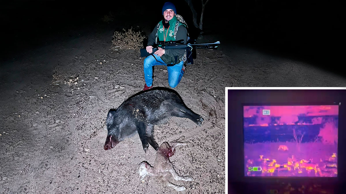 Diego junto al jabalí que abatió mientras devoraba un cordero.