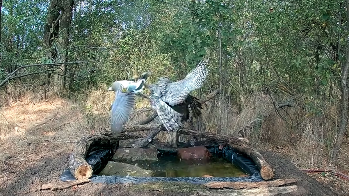 El error de estas migratorias, puesto que vemos cómo otra llega incluso a posarse en las ramas que hay colocadas junto al abrevadero artificial. Esto pilla por sorpresa al depredador, que estaba refrescándose en el agua, y solo le da tiempo a mirar atónito a la tórtola. Segundos después cuenta con otra oportunidad, y esta vez demuestra su condición de cazador letal.