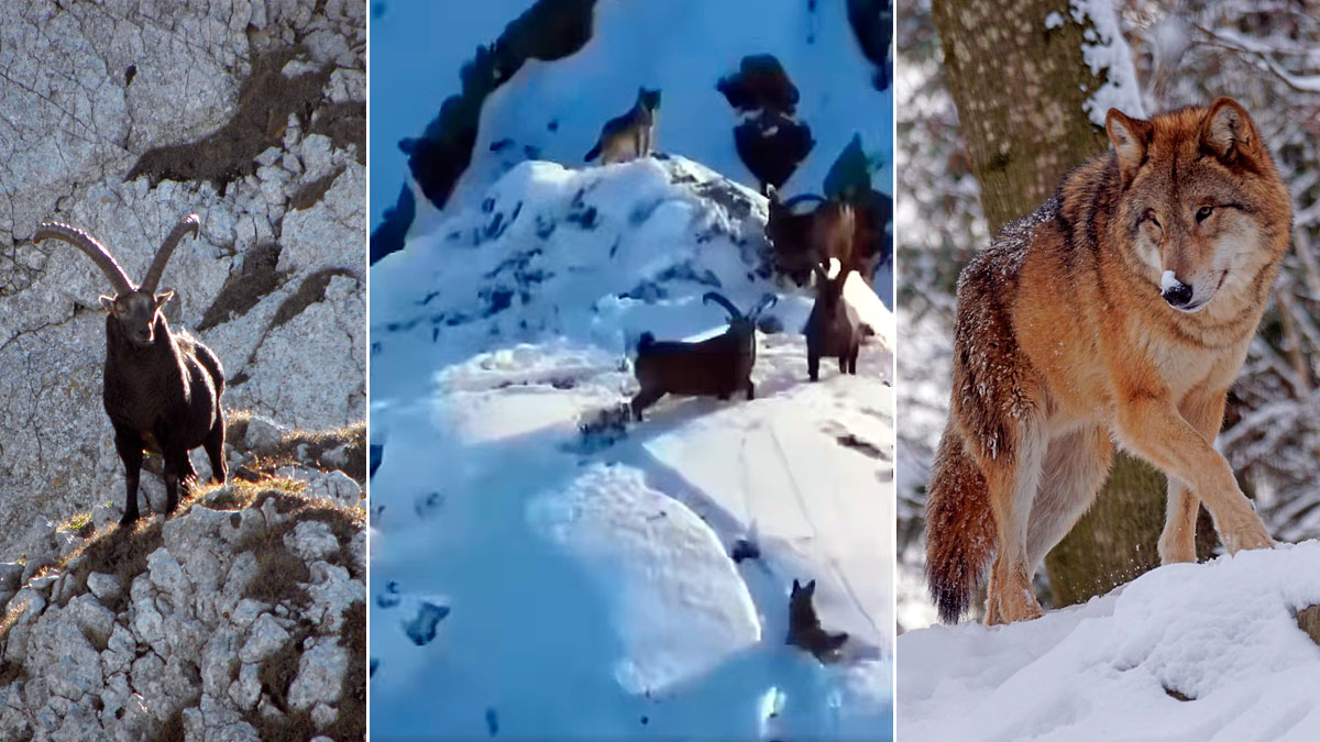 Los tur de Kubán se han situado en una zona alta de esta montaña. Allí, permanecen juntos para poder mejorar la defensa ante los dos lobos que entran en escena. Uno de los depredadores se atreve a intentar atacar al macho que tiene más cerca. Pero le sale muy mal la jugada.
