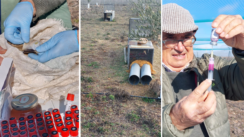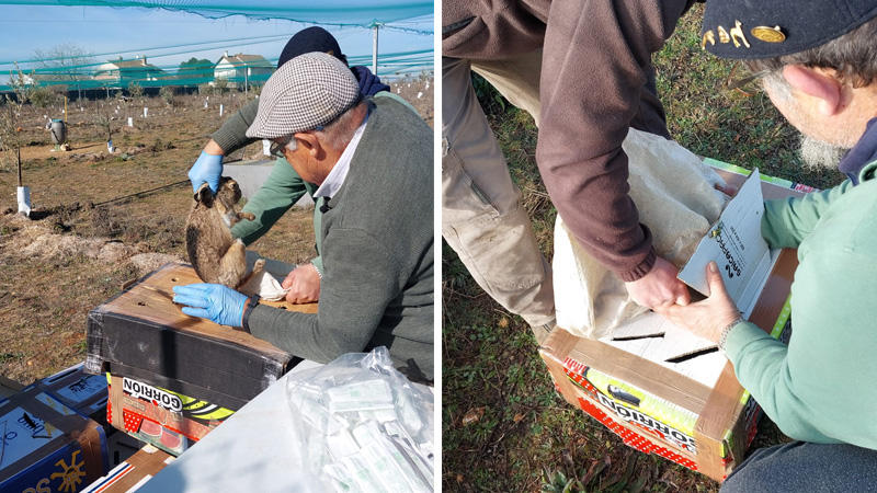 Las liebres están identificadas con un crotal. En el centro, las liebres se refugian en los tubos para ocultarse. A la derecha, una vez capturadas, se procede al control sanitario.