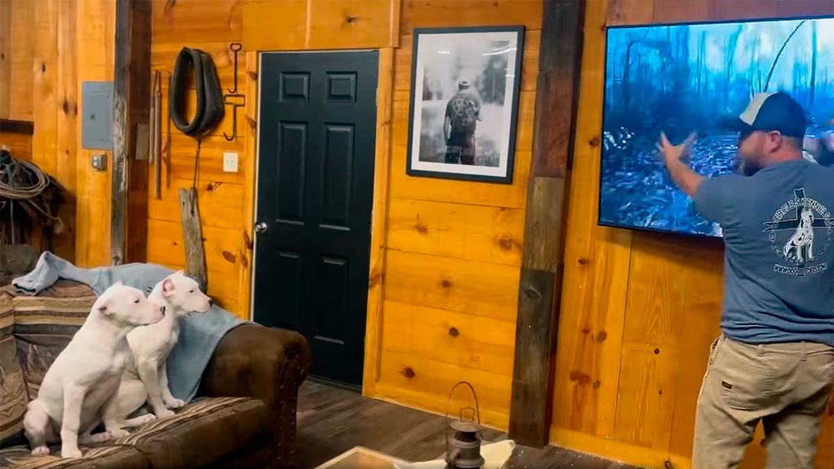 Los perros permanecen muy atentos a la charla táctica del cazador. Un perro a cada lado del jabalí para acosarlo y poder agarrarlo. Algo que parece sencillo, y que estos cachorros de dogo argentino deberán aprender para ir acumulando teoría antes de ponerlo todo en práctica una vez estén listos para salir al monte. Un vídeo que arroja humor a lo que el cazador denomina como “Capacitación obligatoria en materia de seguridad y desarrollo profesional”.