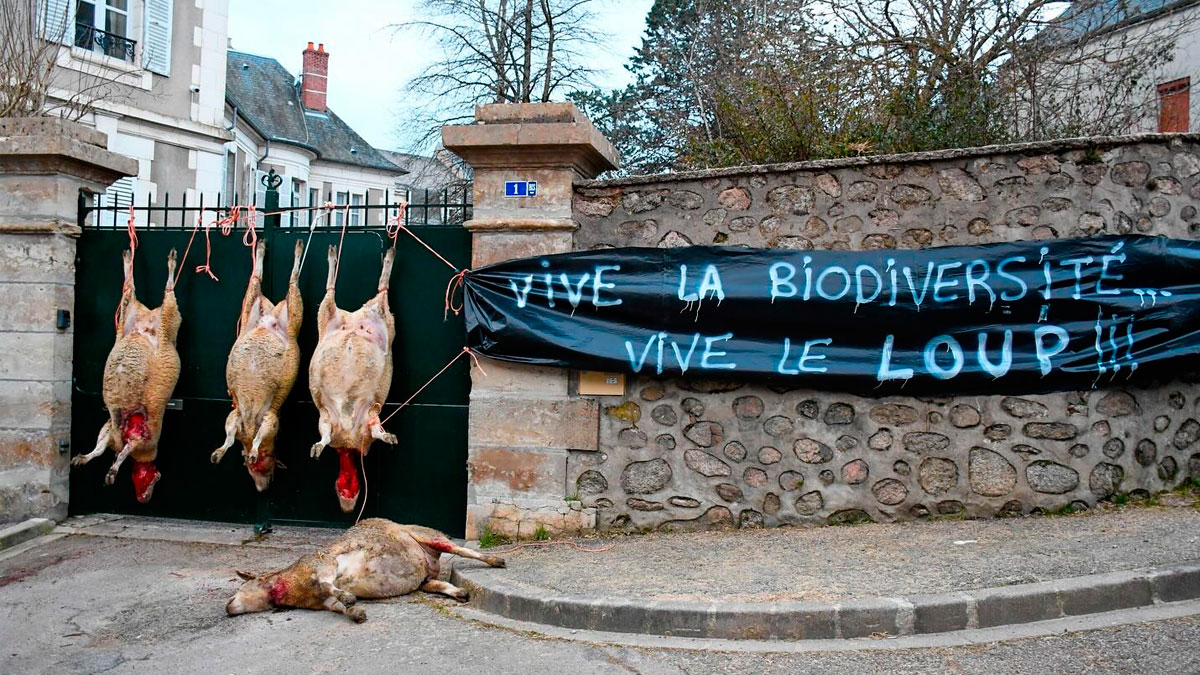 Tres ovejas colgando de una cancela: así protestan los ganaderos franceses por los ataques del lobo a sus animales