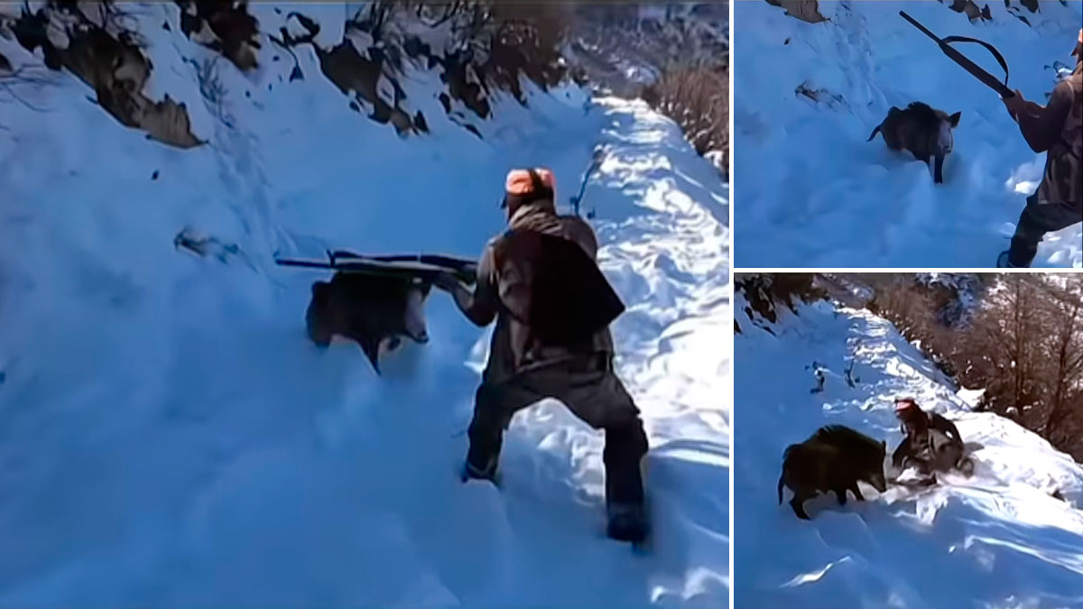El cazador corre para acercarse demasiado al suido, que intenta escabullirse, pero el terreno, totalmente nevado y montañoso, le dificulta que pueda alejarse. Cuando alza su arma, la encara y dispara, podemos comprobar cómo los disparos impactan varios centímetros por encima del cuerpo del animal. El motivo puede estar en esa cercanía extrema que ha elegido el cazador a la hora de posicionarse para disparar al jabalí. El animal estaba inmóvil, por lo que acertarle no entrañaba dificultad alguna, más que encarar correctamente.