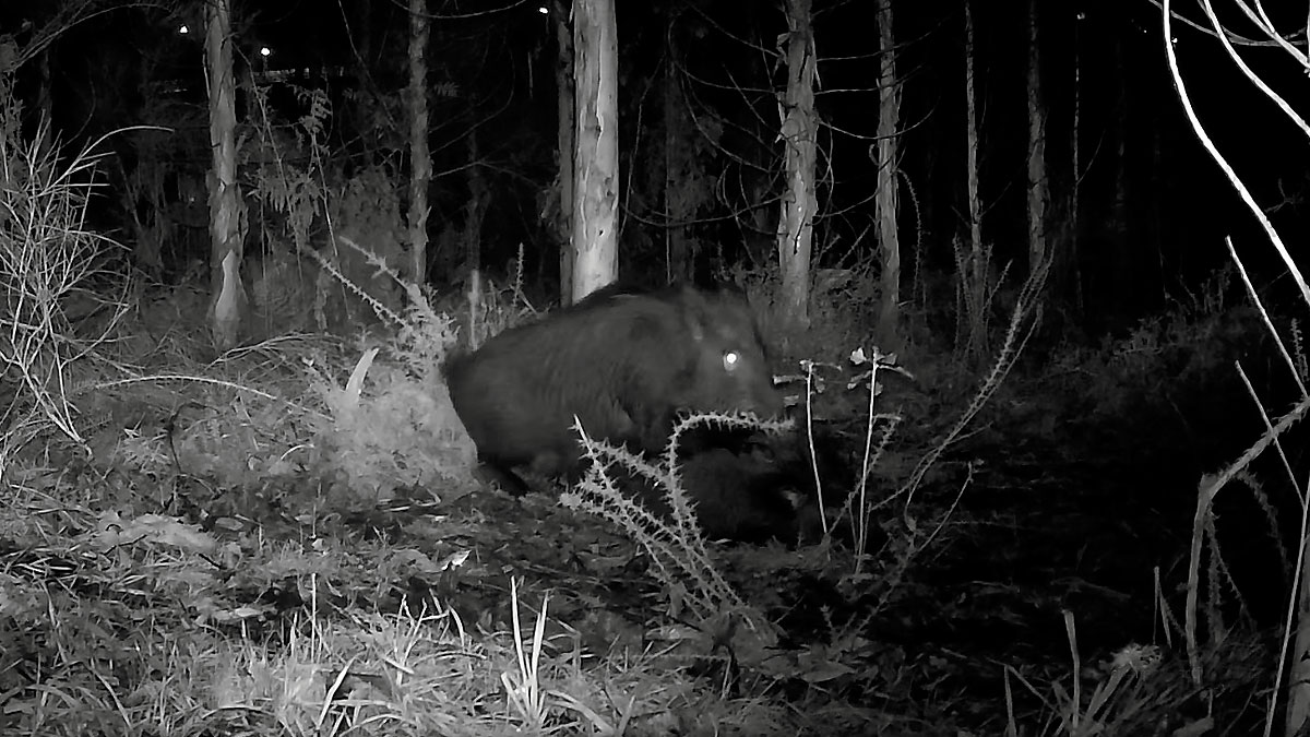 Una hembra de jabalí ha muerto en una mancha de bosque muy cercana a una carretera bastante transitada. Lo comprobamos observando las luces de varios faros de vehículos que iluminan la escena, después de que lo indiquen los responsables de Jrada Montes, una cuenta que encontramos en distintas redes sociales que difunde vídeos de fototrampeo grabados en Galicia.