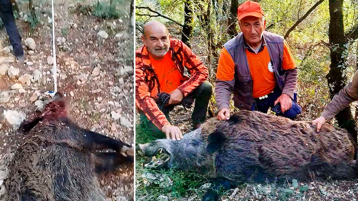Cazan al salto un jabalí de 180 kilos con unas impresionantes defensas de 25 centímetros