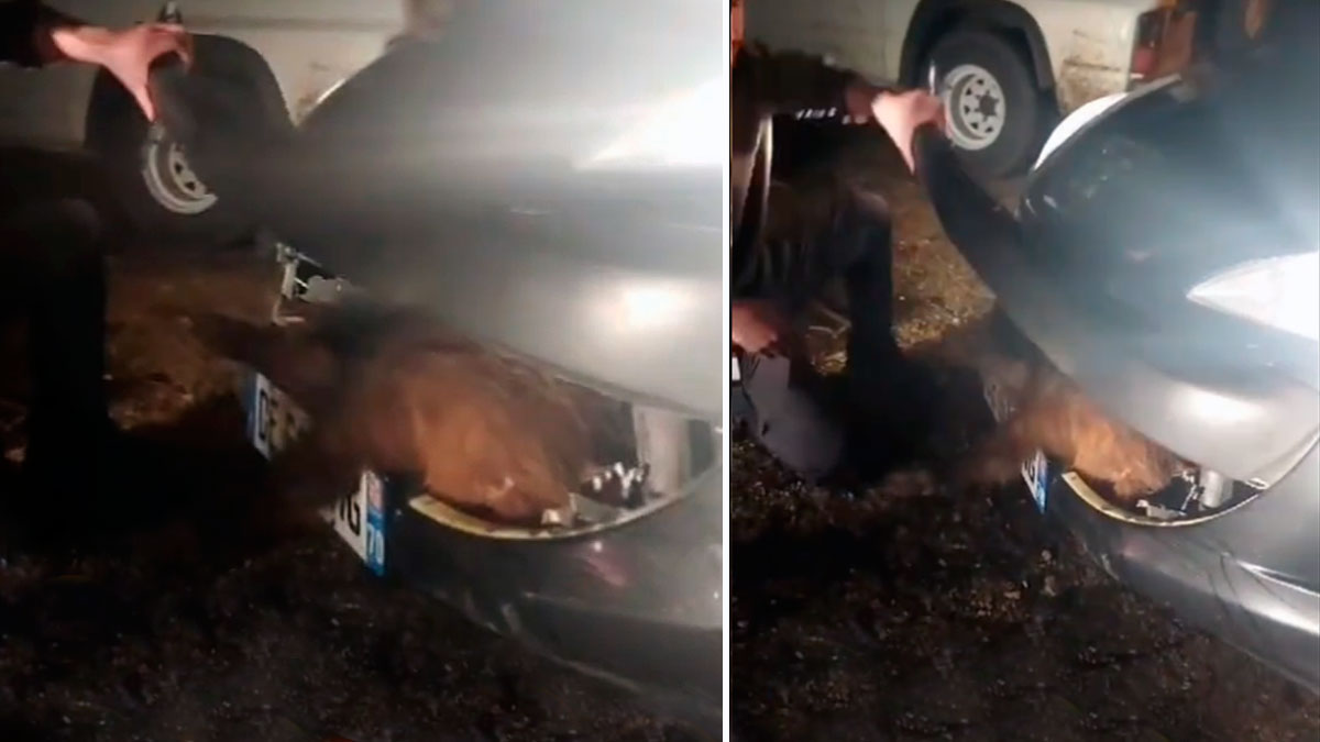 Uno de los ocupantes del Peugeot levanta el maltrecho paragolpes delantero para que podamos ver al animal. Una situación desgraciadamente bastante común cuando suceden este tipo de accidentes. La parte más vulnerable del frontal de los vehículos cede ante el peso del animal atropellado, ya sea un cánido, una pequeña liebre o un cérvido, y acontecen situaciones como las que te proponemos a continuación.