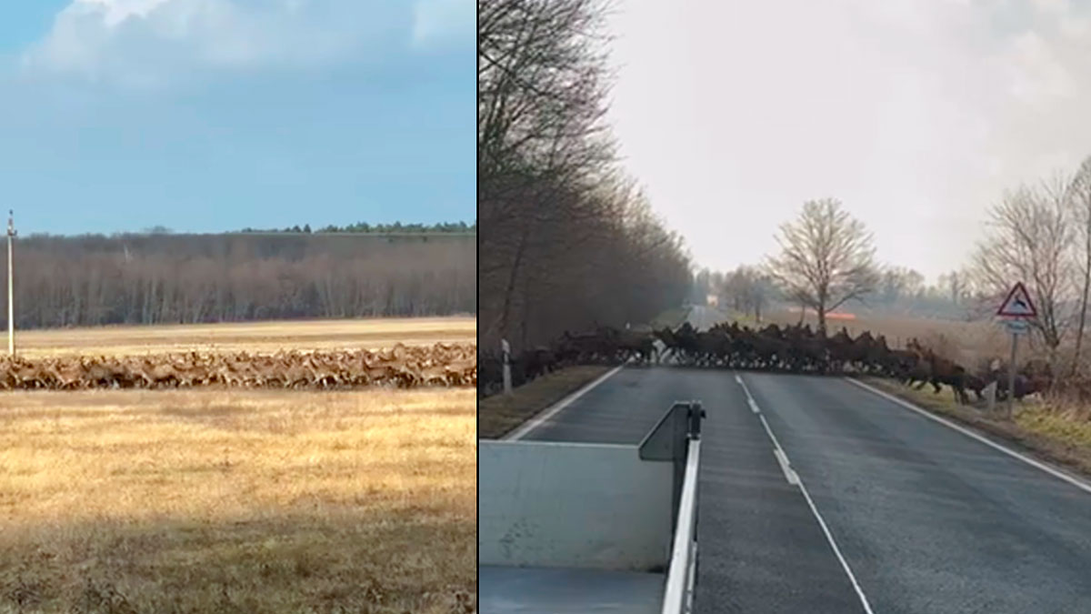 Beck Roland, un ciudadano húngaro, en un desplazamiento entre Vése y Böhönye, pueblo ubicado en el distrito de Marcali, en el condado de Somogy, sorprende a más de un centenar de venados en un prado. Los animales provenían de una zona arbolada. Huían de algún peligro. Por suerte, el lugar por el que cruzaron el asfalto era una recta con gran visibilidad para los conductores. La persona que graba el paso de los animales detiene su coche para completar este impresionante espectáculo. Las imágenes han sido publicadas por el medio local Somogy TV.