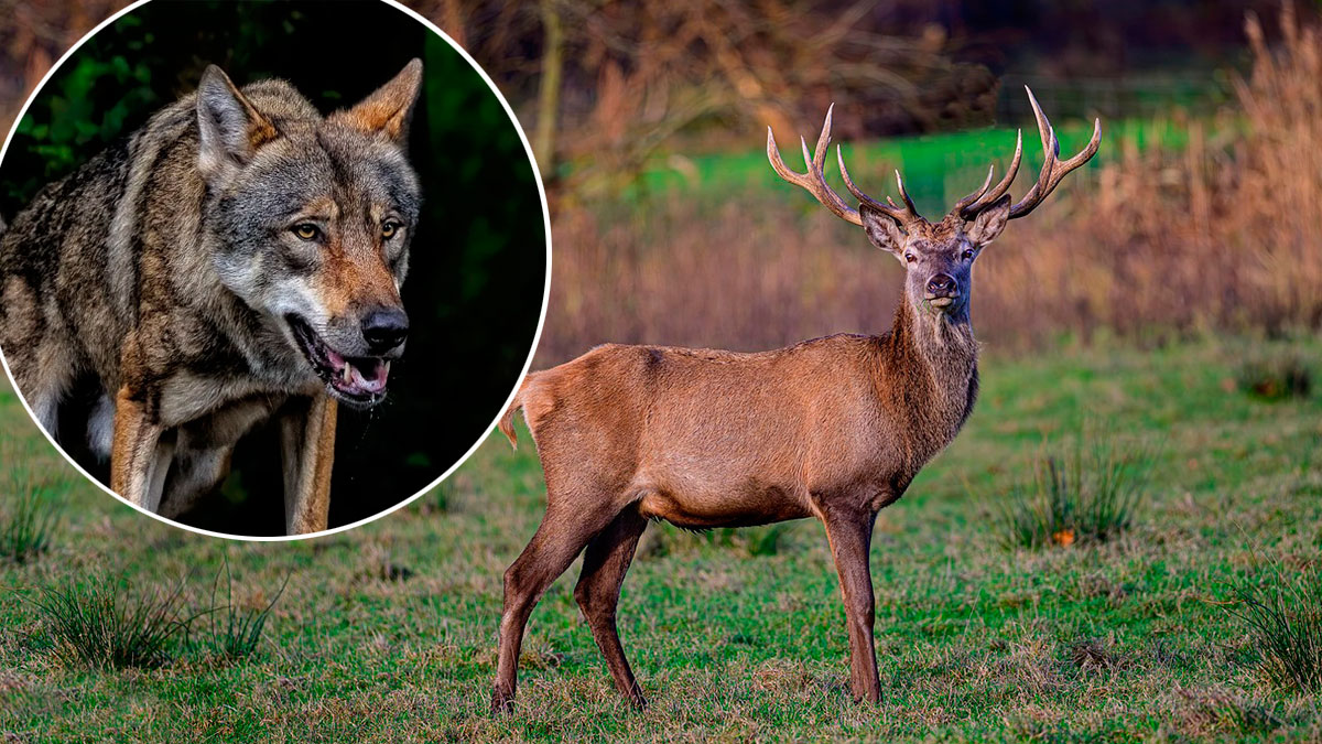 El depredador que está oculto al otro lado del caudal de agua emerge de entre los árboles. Atraviesa el río como una exhalación para dar caza a uno de los cuatro ciervos. El lobo y tres de los venados se pierden entre la vegetación que hay próxima a la carretera.