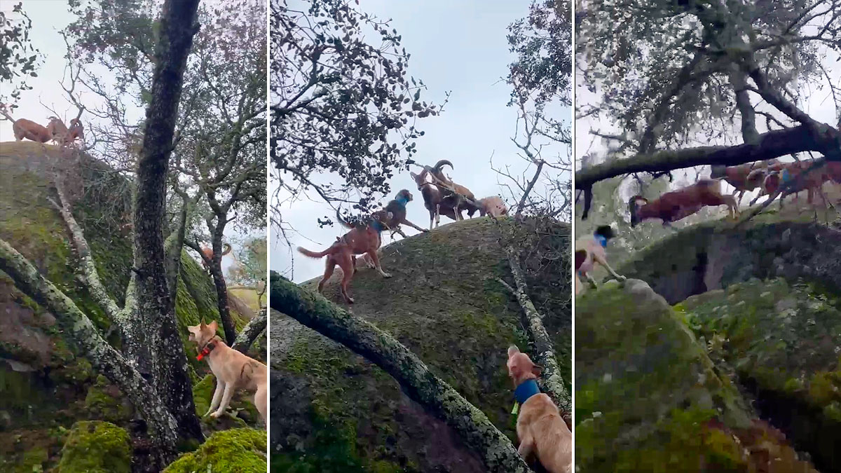 Los bóvidos han escalado hasta la parte superior de una gran roca para escapar de los perros de la rehala Raya. No dudan en embestir a los canes cuando tratan de agarrarlos.