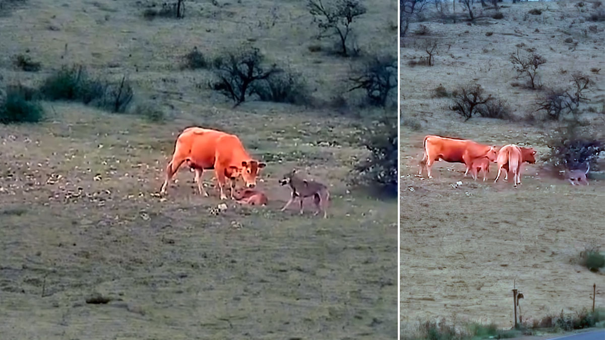 Afortunadamente, otra vaca se acerca apresuradamente y utiliza su cuerpo como protección del pequeño ternero. Ahora sí son capaces, las dos trabajando juntas, de mantener al atacante a distancia de la cría. “Menos mal que ayuda la otra vaca, que es más adulta”, apunta uno de los usuarios de Facebook que ha comentado el vídeo.