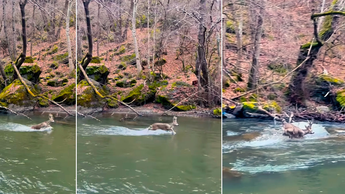El animal avanza ágil y rápidamente por el interior del cauce de este río. Su capacidad de salto le permite alcanzar la orilla lejos de la persona que le ha llevado a elegir una manera tan peligrosa de hacerlo.