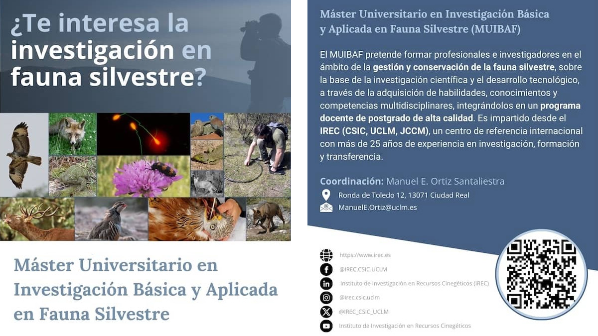 El 18 de marzo estarán abiertos los plazos de preinscripción y admisión del Máster Universitario en Investigación Básica y Aplicada en Fauna Silvestre (MUIBAF), una formación de excelencia de la Universidad de Castilla-La Mancha (UCLM) diseñada para la capacitación integral de profesionales e investigadores en el estudio, conservación y gestión de la fauna silvestre.