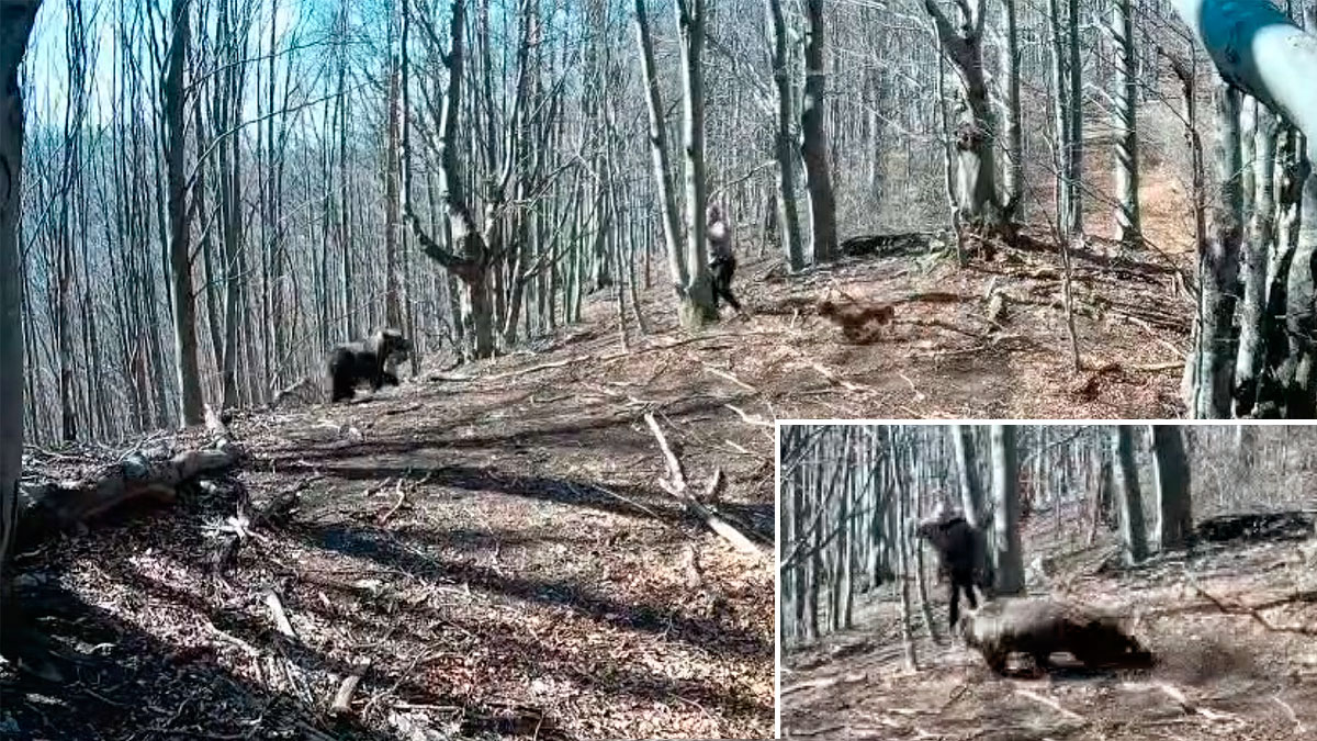 El úrsido no lo duda un instante y carga contra el humano. Y lo hace en varias ocasiones al fallar en su acometida inicial. La pericia de este hombre con el palo que lleva en la mano le salva la vida en ambas embestidas. La primera le sirve para golpear al oso, un ejemplar aún no maduro, pero de un tamaño considerable. El golpe aleja al depredador, pero solo durante unos segundos, puesto que enseguida le vemos aparecer de nuevo en el encuadre de la cámara trampa que ha grabado todo el ataque.