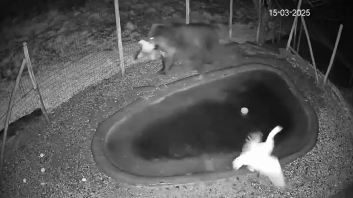 El 15 de marzo, el plantígrado fue grabado por primera vez en la propiedad. Una cámara colocada en el estanque en el que se encontraban dos gansos inmortaliza el momento en el que el depredador accede sin dificultad alguna a la zona vallada, captura un ganso y se lo lleva para comérselo fuera del objetivo del dispositivo.