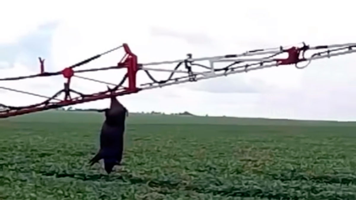 No es algo aislado que una máquina agrícola acabe con la vida de los jabalíes que se resisten a salir de los campos cultivados cuando comienzan los trabajos, sobre todo los de la cosecha, como veremos más abajo. Lo realmente impresionante es que, en esta ocasión, el cochino ha quedado atrapado entre los hierros de un pulverizador suspendido. Estamos ante una de las herramientas más utilizadas en los campos agrícolas. Se encarga de aplicar agroquímicos destinados a proteger los cultivos de las plagas, insectos y enfermedades que las pueden perjudicar.