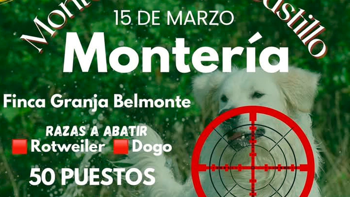 En la página de Facebook de la «Granja de carne de perro ecológica» podemos encontrar publicado el cartel anunciador de la montería en el que figura la fecha, el lugar de celebración, las especies a abatir, el menú del almuerzo y el precio de la cacería.