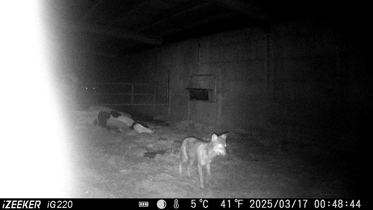 Ante el temor que no se le indemnice por la muerte de la vaca, el ganadero decide no retirar el cadáver para ver si al que él señala como culpable del ataque vuelve a la cuadra para alimentarse. Pasadas las doce de la noche el objetivo de la cámara graba a un lobo solitario entrando en la instalación y alimentándose de la vaca. Horas más tarde un zorro también visita la edificación.