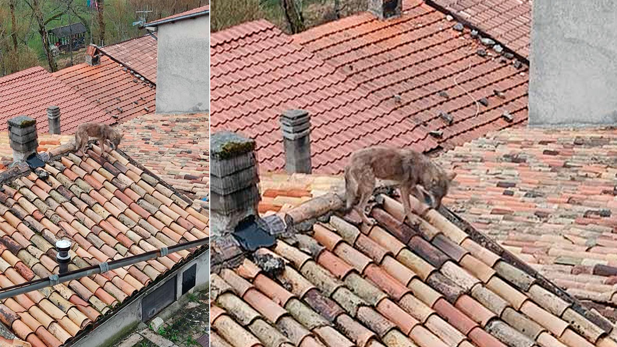 Un lobo impacta en un pueblo al ser fotografiado en un tejado