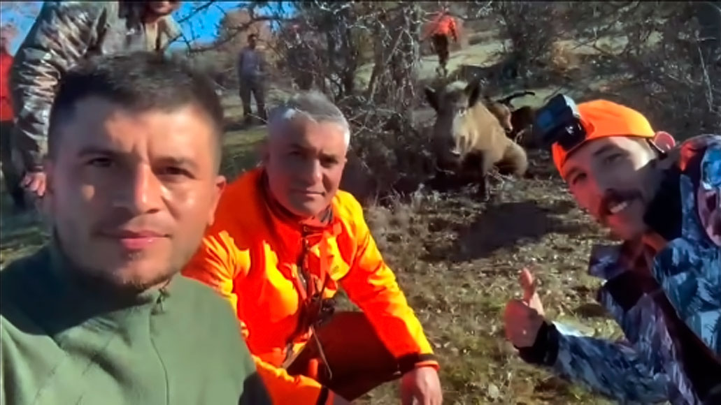 Las prisas por grabar un vídeo junto al animal abatido les ha jugado una mala pasada a este grupo de cazadores cuando el jabalí recupera la vitalidad suficiente para levantarse y sembrar el pánico.