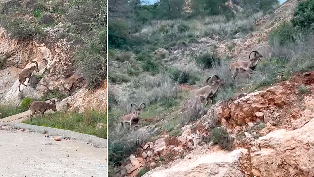 Cuatro ejemplares de Capra pirenaica hispánica, un endemismo de la Península Ibérica que habita en zonas de sierra y montaña de los montes de Málaga, Córdoba, Cádiz, Jaén y, como vemos en la grabación que compartimos hoy, en Granada.