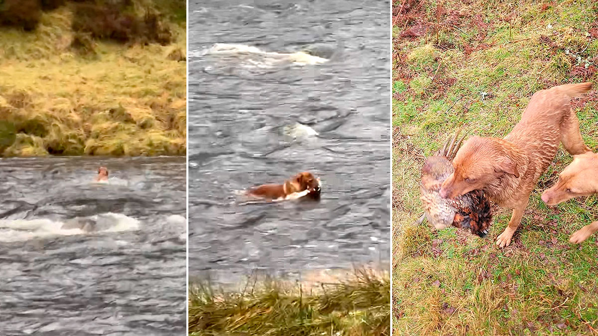 En la cacería están participando los propietarios de Carnochway Red Rooster y sus perros de cobro. Pese a que el lance se desarrolla en pleno invierno, el perro se lanza a las aguas. No sin esfuerzo atraviesa el caudal. Necesita tan solo un minuto para encontrar el faisán entre la vegetación. Con él entre las fauces vuelve a cruzar la corriente.