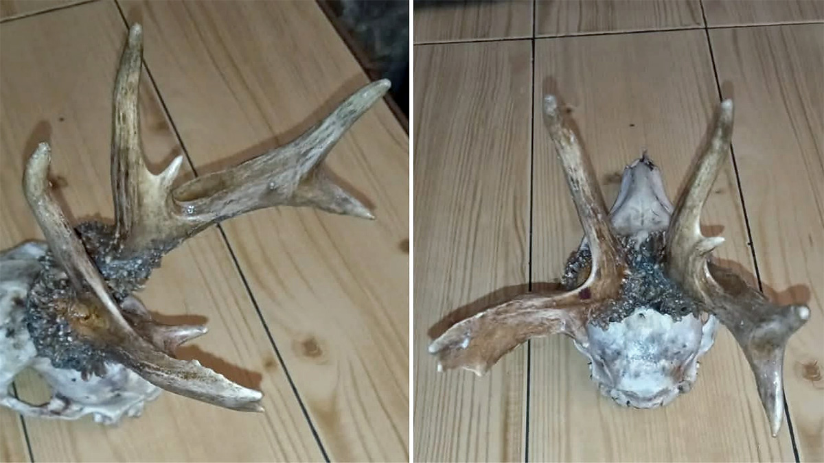 La cuerna derecha del macho cuenta con cuatro puntas, mientras que la izquierda suma otras seis. Las rosetas están unidas y están cubiertas de un grueso y abundante perlado.