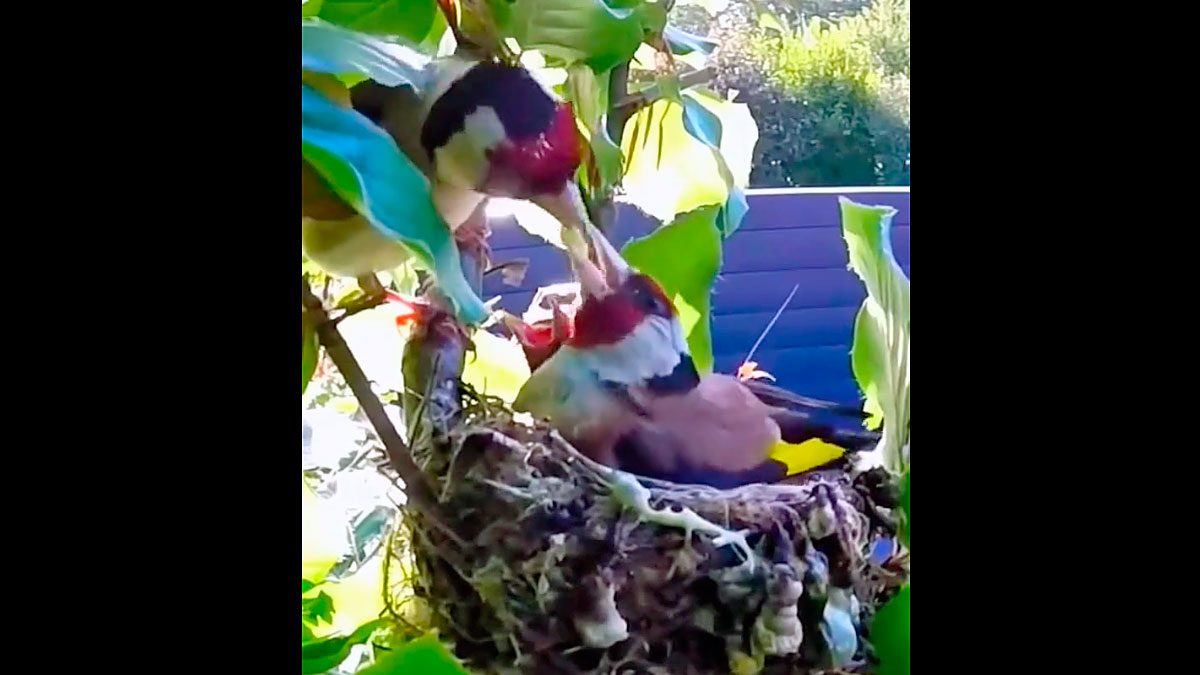 Un jilguero alimenta a su pareja y a un pollo en el nido