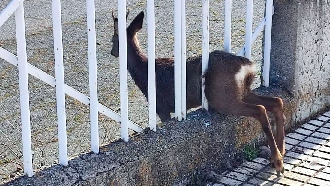 El pequeño cérvido, un macho de corta edad, intentó entrar a través de los barrotes metálicos. Consiguió introducir la cabeza, el cuello y la mitad del cuerpo. Pero al llegar a los cuartos traseros, la cadera y las patas se convirtieron en un tope insalvable y su cuerpo quedó preso allí.