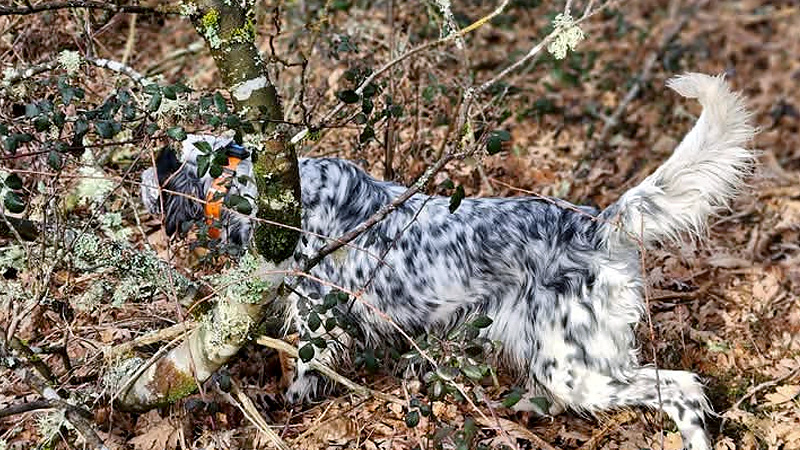 Un cachorro de setter inglés guía, muestra y recupera una becada