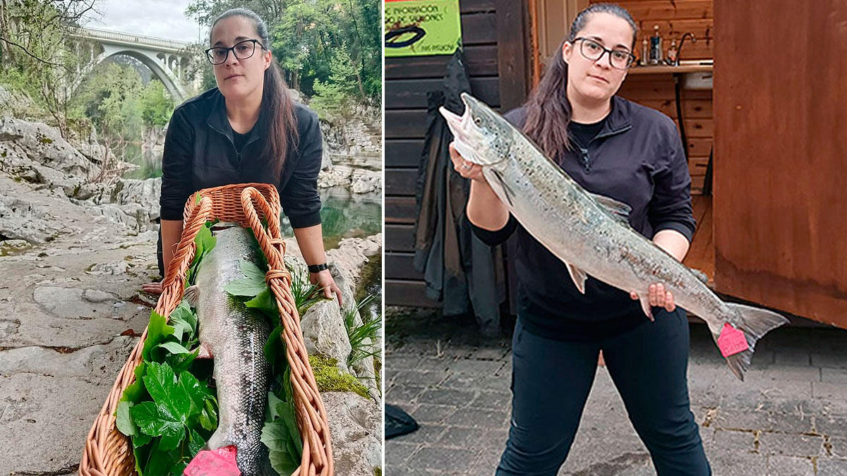 La pescadora con el ejemplar de salmón capturado ayer en Cantabria.