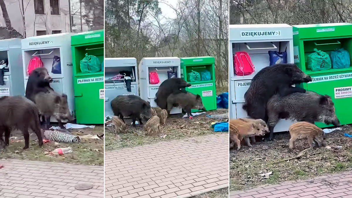 Los jabalíes han llegado a las ciudades para quedarse. En muchos núcleos urbanos encuentran todo lo necesario para satisfacer sus instintos y necesidades. Encuentran alimento en los cubos, papeleras y contenedores de basura. Las zonas verdes les brindan un hábitat tranquilo en el que no entran, generalmente, los depredadores que los persiguen en bosques y montes. Y a esa tranquilidad hay que añadirle que en época de celo nada les impide engendrar, como vemos en las siguientes imágenes, grabadas en las calles de una ciudad polaca.