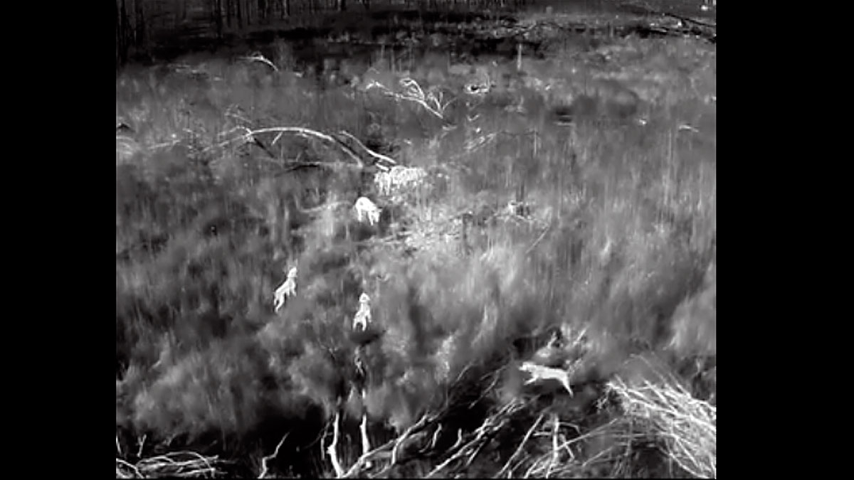 La cámara de fototrampeo colocada por un naturalista graba la escena de caza natural. Dos de los cánidos salvajes que han atacado al grupo de hembras aparecen frente al objetivo del dispositivo con una cría entre las fauces.