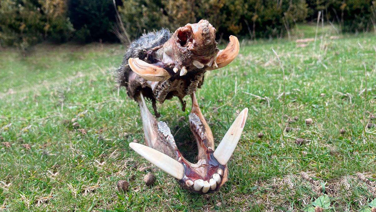 De la mandíbula inferior del ejemplar sobresalían unos impresionantes colmillos. No es la primera vez que los cazadores hallan trofeos de caza en el campo. En años anteriores y en similares circunstancias han descubierto una cabeza de ciervo con 10 puntas y una de rebeco con unos bonitos cuernos.