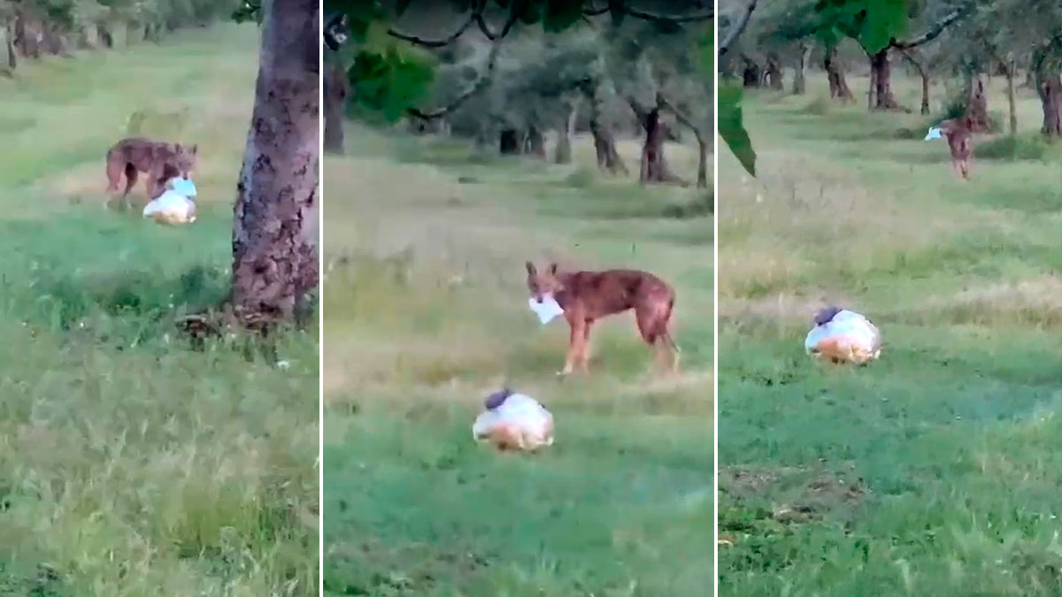 El agricultor prefiere no plantar cara al lobo. El depredador busca alimento en una bolsa que está depositada en el suelo en una plantación de frutales. Ante la cercanía del lobo, el hombre se limita a grabar la escena para que quede constancia del encuentro. No se atreve a enfrentarse al animal para salvar su almuerzo.