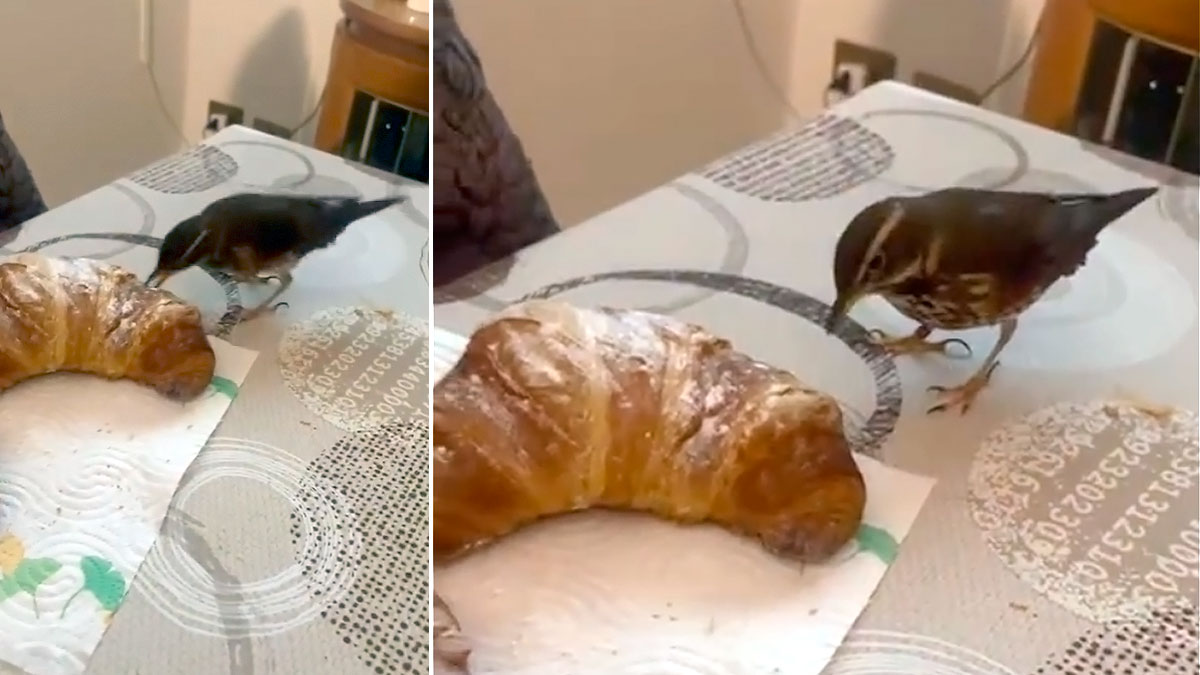 En esta ocasión, el pájaro desayuna una pieza de panadería. Picotea el cruasán con tal fuerza que lo desplaza por la mesa. Los zorzales alirrojos son omnívoros. Se alimentan habitualmente de lombrices, caracoles, insectos, frutas blandas, bayas, lentiscos o aceitunas.