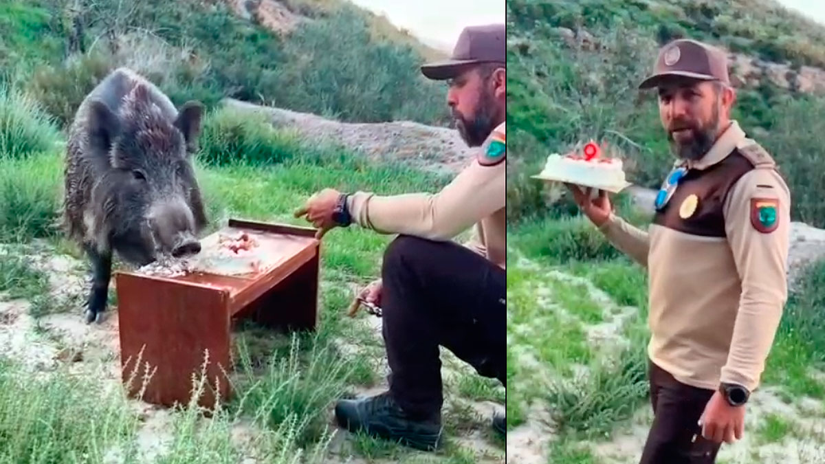 Un guarda rural celebra el cumpleaños de un enorme jabalí