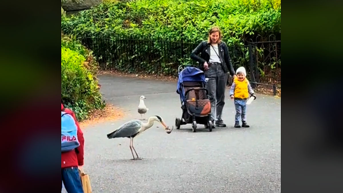 Una garza real caza una rata en un parque ante la mirada atónita de varios niños