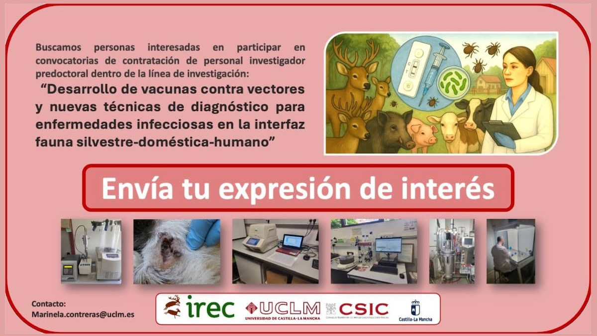 Por ello, el Grupo de Investigación en Sanidad y Biotecnología (SaBio) del Instituto de Investigación en Recursos Cinegéticos (IREC – CSIC, UCLM, JCCM) busca personal interesado en participar en la próxima convocatoria de contratación de personal investigador predoctoral de la Universidad de Castilla-La Mancha (UCLM) para incorporarse a la línea de investigación “Desarrollo de vacunas contra vectores y nuevas técnicas de diagnóstico para enfermedades infecciosas en la interfaz fauna silvestre-doméstica-humano”.
