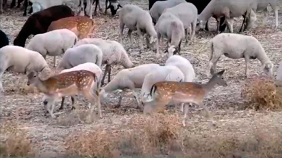 Gamos y ovejas comparten el pasto en la Sierra de Andújar