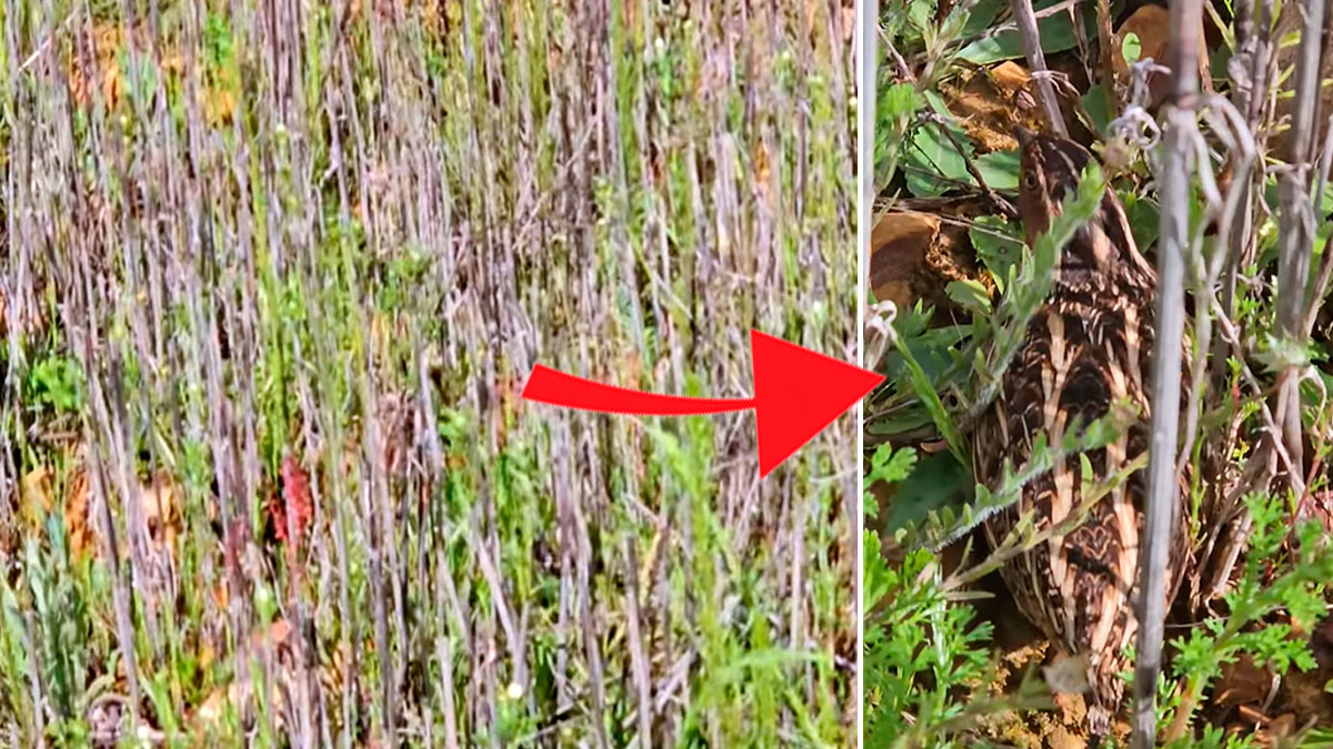 Un agricultor detecta una codorniz prácticamente invisible en el campo