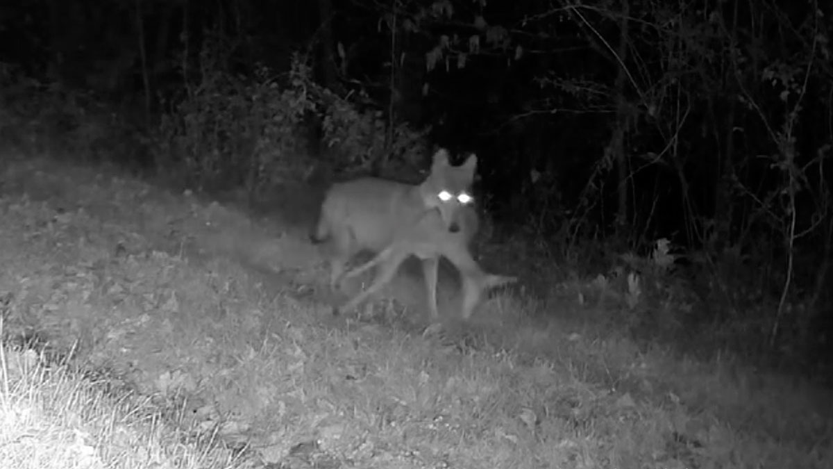 Un lobo se pasea con un corcino entre las fauces frente al objetivo de una cámara de fototrampeo