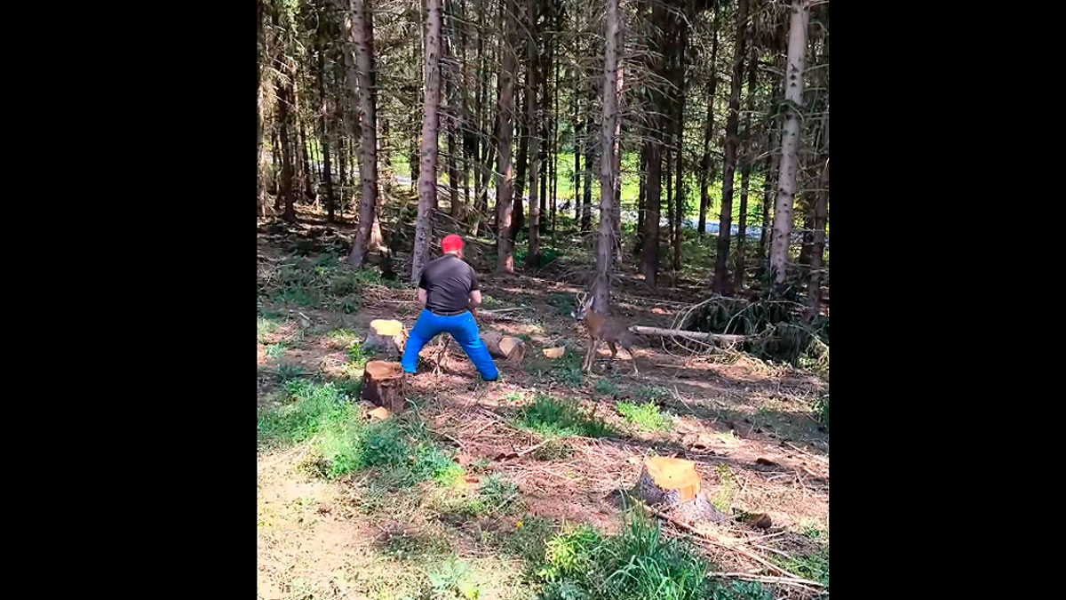 Un corzo agresivo planta cara a un trabajador en mitad del bosque