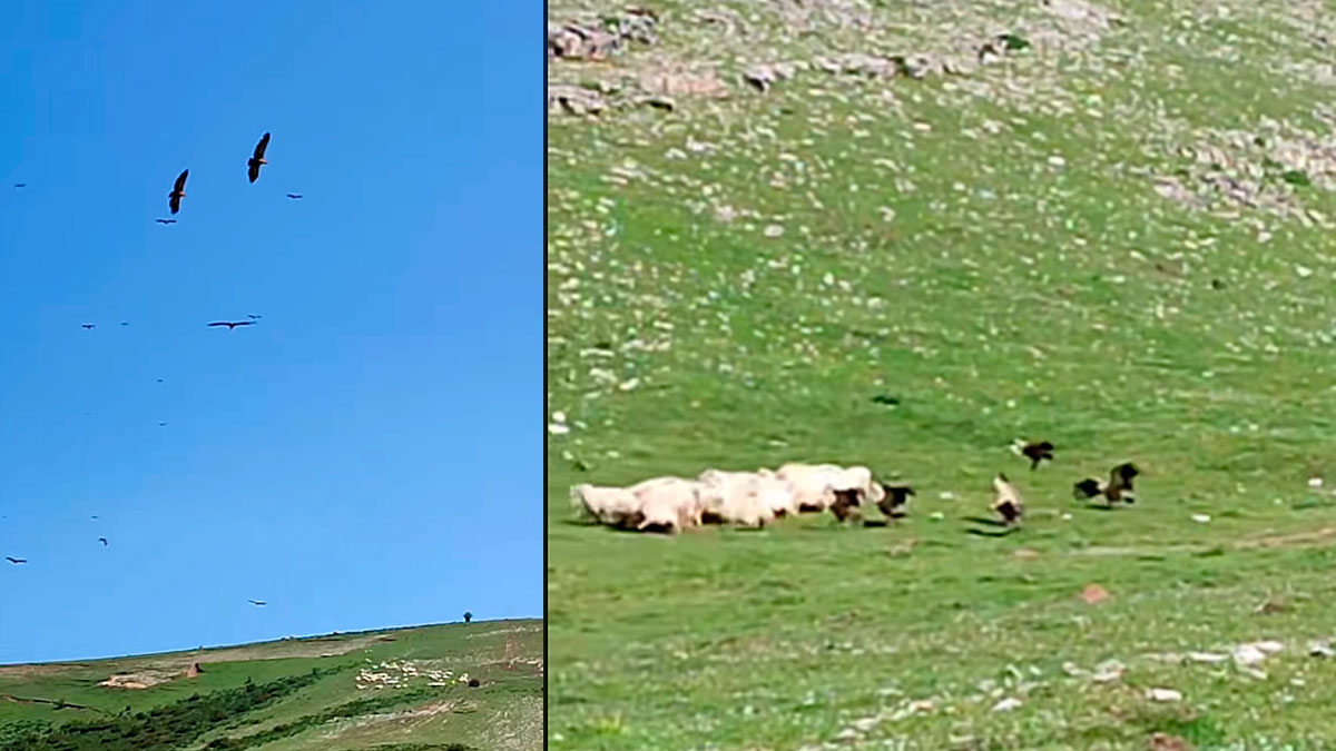 El propietario de las reses graba a los buitres en el momento que están atacando a los animales. Corre hacia las asustadas ovejas para evitar que se las coman vivas.