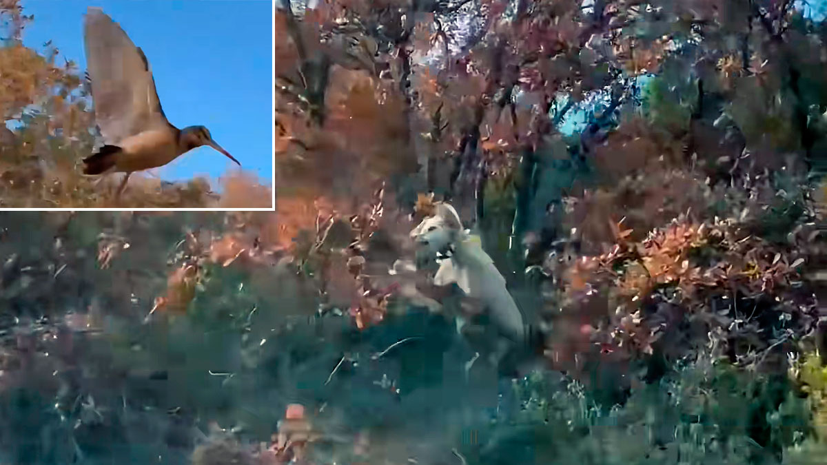 Este impactante vídeo nos permite ver cómo el perro de muestra queda con varias plumas en su boca tras saltar ágilmente ante una becada que arranca en vuelo delante de su hocico.