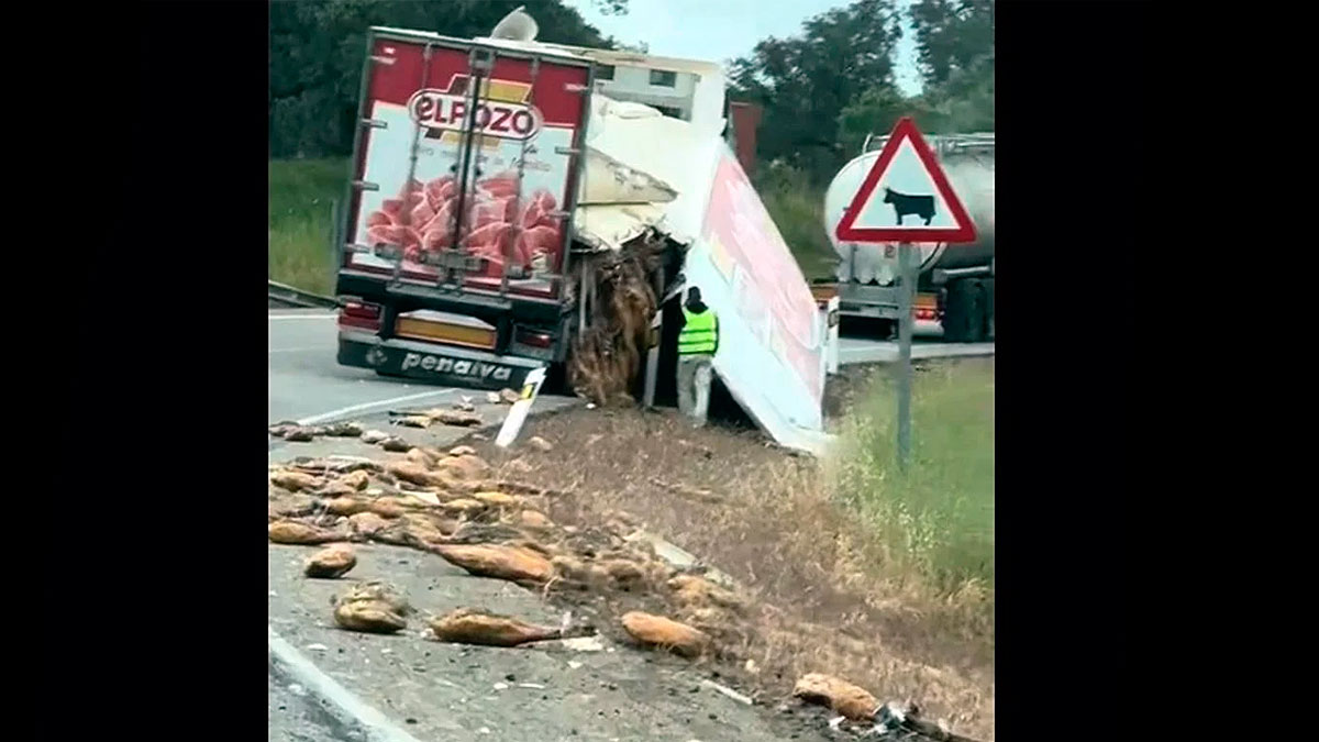 El conductor de un camión de una conocida firma nacional de embutidos circulaba por la carretera N-433 en el kilómetro 66, a la altura del término municipal de Zufre, en la provincia de Huelva. Al tomar una curva, algo salió mal y el contenedor del camión se quebró por varios puntos y quedó destrozado, produciendo la caída de las patas de cerdo y dejando decenas de ellas esparcidas sobre el asfalto.